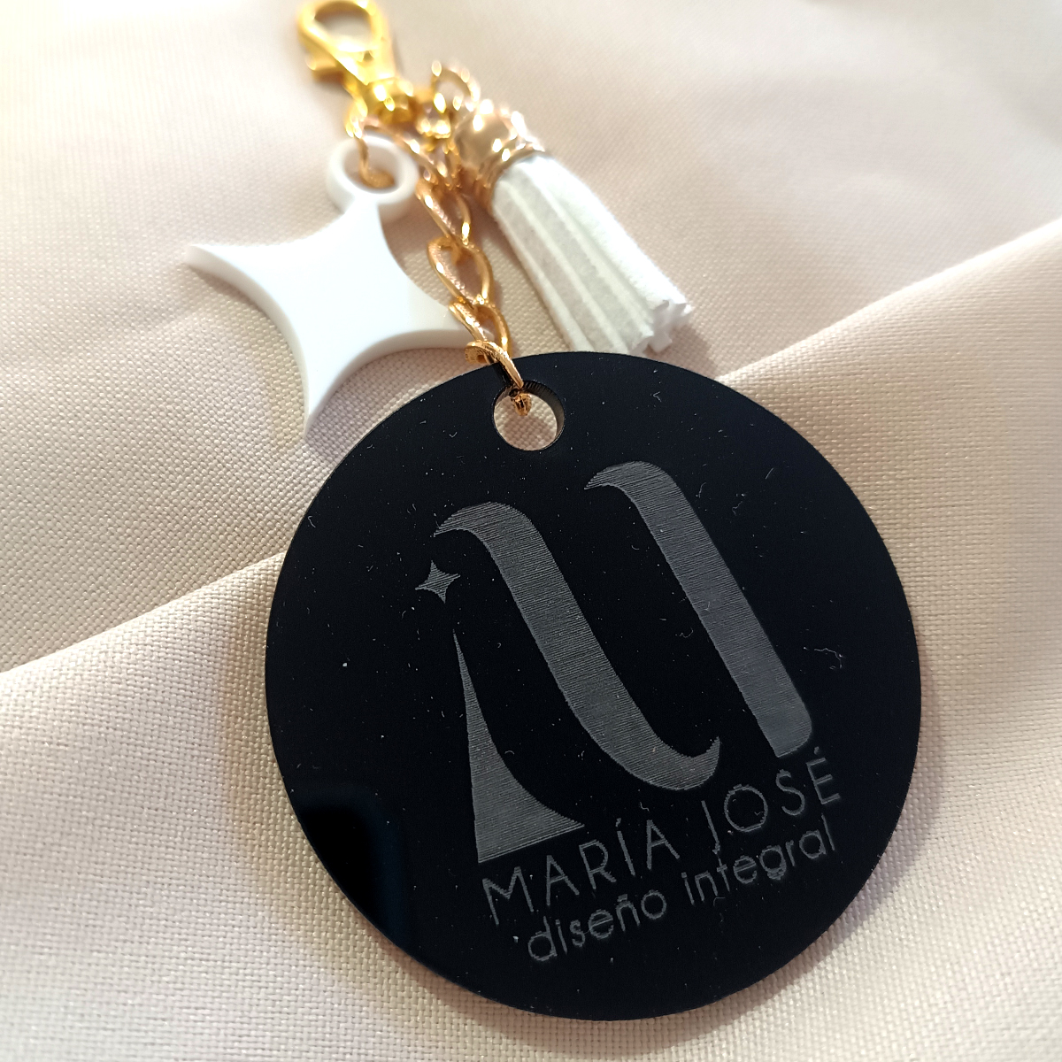 Incluye Argolla de gancho dorada y Borla de color